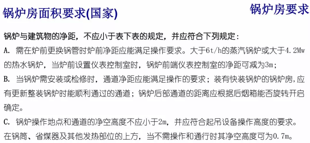 SHX 循環(huán)流化床蒸汽鍋爐熱水鍋爐改造的基本注意事項不外乎,鍋爐房安裝空間、鍋爐房電氣連接、鍋爐房燃氣系統(tǒng)、鍋爐房新風系統(tǒng)、鍋爐房煙氣系統(tǒng)幾部分。針對鍋爐房的空間要求在和鍋爐的廠家確認鍋爐的檢修空間和安全通道。這里需要注意鍋爐的控制系統(tǒng)的安裝位置,要放置在較為便于操作的位置。同時鍋爐房面積也有一定的要求: